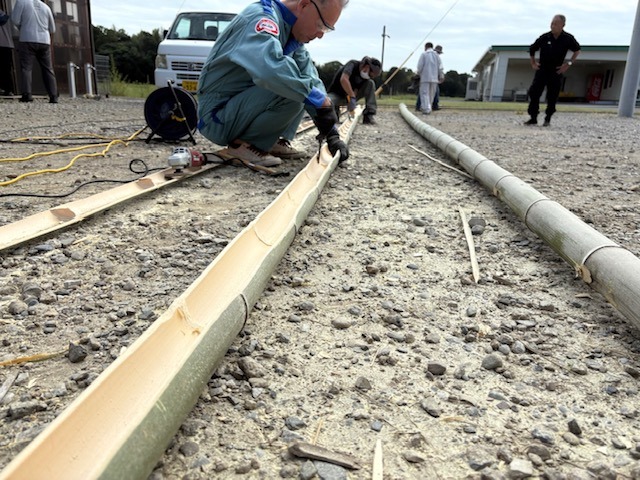 ピアフェスタに向け流しそうめん用の竹を職員さんが手作りで作成。
