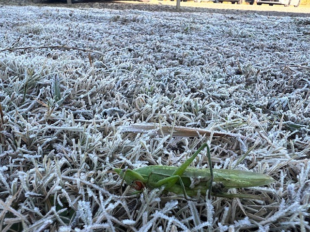 今期一番の冷え込んだ朝、出社すると芝生の上に